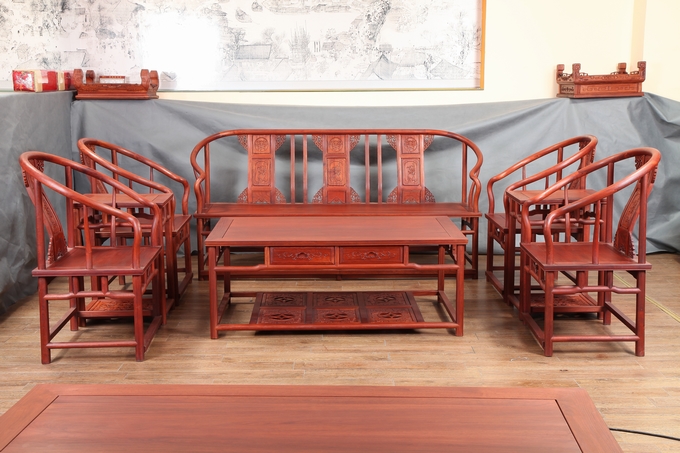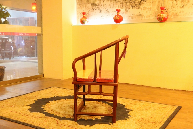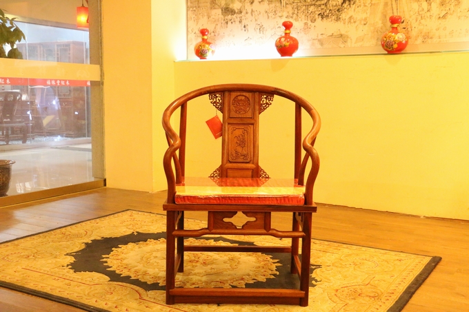 先來看看單人位沙發——圈椅,此圈椅沿襲了明代遺風,總體柔婉流暢的線條,顯露出設計者巧思之美;而少見的不出頭扶手直接與鵝脖相卯合,給人以纖秀雅巧的感覺;加上優質的緬甸花梨木作為用材,使較易損壞的椅圈也更顯牢固堅硬,兼具了形態之美與優秀的做工的同時,還擁有著良好的用材,優美優質。雕飾圖案上的內容包括有:在靠背板處的上方——一輪外圓框鑲嵌而內的艷麗的牡丹花紋飾作為點綴,昭顯著”富貴”與”祥和”之瑞氣;中間位置還有——一株插在瓶器中的花草清野以及一矮小型的長青株卉,透露出一股淡淡的青草氣息,花香悠長,自然生氣;另外在其靠背板上下的左右兩側以及券口牙子部分還雕飾有些許簡單的鏤空紋飾作為處理,給整體營造出一種典雅的中國風氣息感受,細膩而又含蓄。