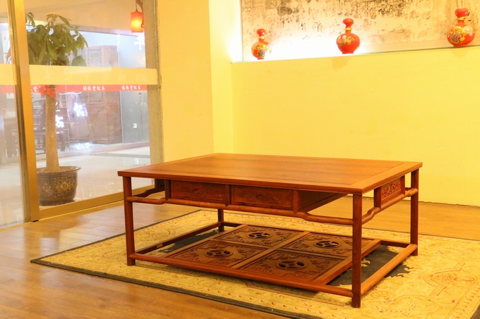 另外該套沙發同樣是為了滿足其人們實用性的需求,在大平幾的上方特別精心設計了左右兩格抽屜,方便了人們平時使用時用來存放物品。素面淡雅的桌面,光整圓潤,簡約筆直的座腳設計,暗合了整套沙發圈椅中注重線條感之特點,另外平幾下方的踏板之上還設有一繪有四格的“四蝠朝古錢”的紋飾圖案,象征著滾滾財源以及美好與幸福的祝福寓意。而高幾處之設計風格同樣與沙發大平幾保持了一致,使之搭配更為一體,而唯一一處雕飾同樣是位于高幾的下方板面處,那形似蔓草(亦稱唐草,隋唐時期特別流行)的紋飾,加之些許鏤空雕刻作為處理,在更顯古典古風之余還寄寓了人們、長久的吉祥寓意,莊華而浮美。