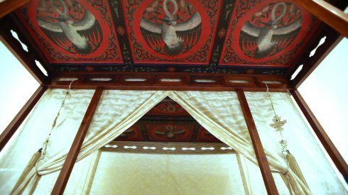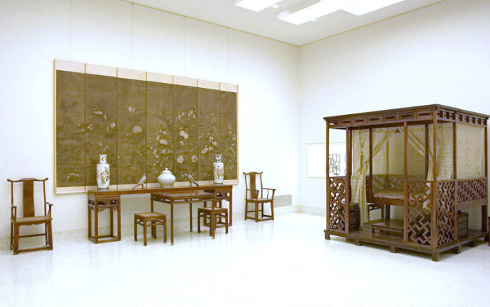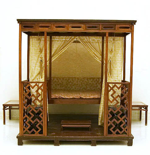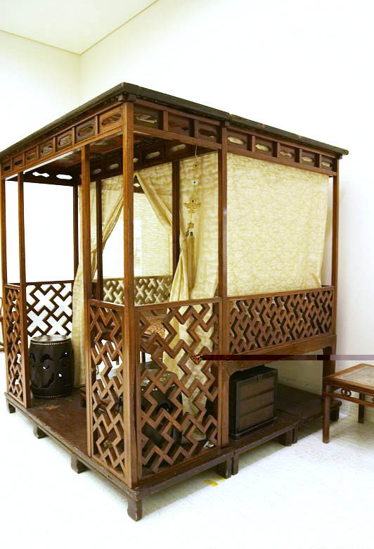 拔步床簡直就是個小房子,是建在木質地坪上的房中房。床的四周掛上帷幔,是極為私密的空間。有些甚至幾重帷幔,連床前的門廊也遮掩起來,冬天是和暖的溫床,夏天驅避蚊蟲襲擾,在南方使用較多。